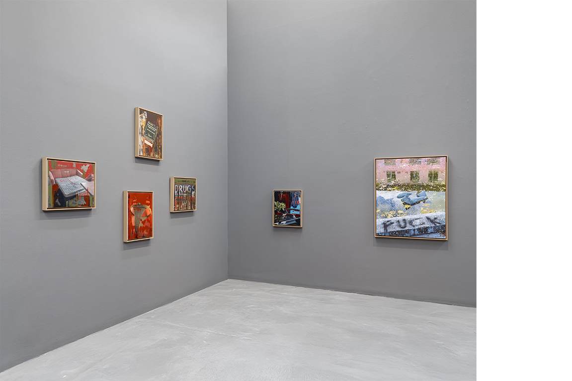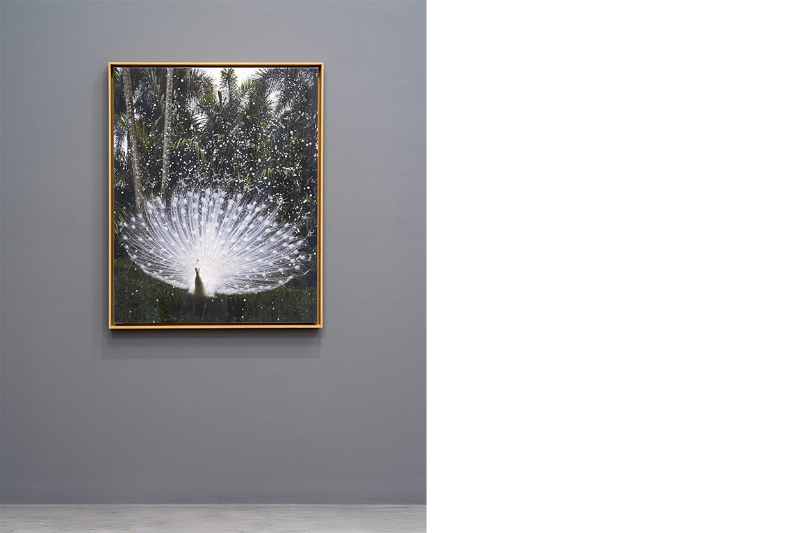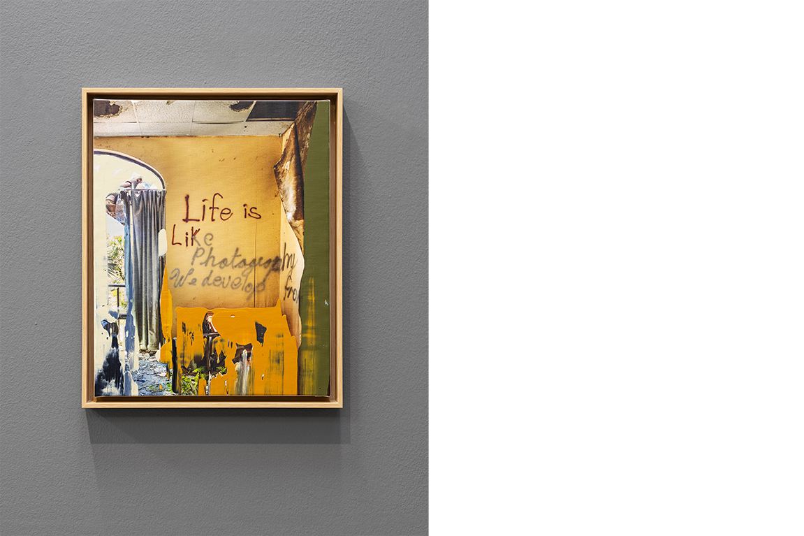 The works oscillate between lushness and abrasion: a peacock’s plume dissolves into a storm of white pigment; a veteran salutes amid roses; a roadside room bears the inscription, “Life is like photography, we develop”; a tattered flag and a graffitied sofa evoke private histories of longing and loss. Each piece becomes a meditation on what endures when ideals falter—how beauty and disillusionment coexist in the same frame.