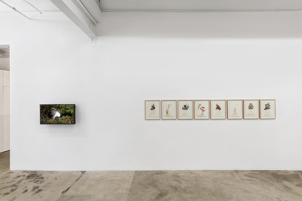 Garcia's installation On the Altars of Vanity, 2017-19, alludes to the ghost of frivolity that hovers around Miami and infects the living standards of the Florida communities. This installation - consisting of videos, photos and watercolors - considers the earth as a physical body subjected to the dangers of corruption, the whims of the economy and the lust for prestige, as well as its ostentation. Here Garcia composes a polyphonic "scenario" starting from the events that threatened, and continue to threaten, the safety of the splendid subtropical marshland ecoregion of the Everglades always at risk due to the invasive and corrosive actions of man dictated by pleasure and leisure above all. Observing the immense expanse of swamps, marshes and islets, stretching from Lake Okeechobee in the north to the Bay of Florida in the south, to the west by the Gulf of Mexico and the Atlantic coast to the east - Garcia traces backwards, thanks to a video which unites documents collected from disparate sources, not only the various attempts at reclamation with canals and drainages (highly damaging to the Everglades, formed by an invisible river that is moves imperceptibly from the waters of Lake Okeechobee to over sixty kilometers) and of agricultural development (in particular the cultivation of sugar cane and vegetables that with phosphorus fertilizers devastate the entire ecosystem), but also the massacre of birds carried out to adorn ladies' precious hats in the early decades of the twentieth century. Given that narcissism demands attention and adulation, the artist showcases the exhibition of vanity (in fact precisely as in Diderot's Encyclopedia which denounced those who famish luxurious clothing) presenting in the installation a series of watercolors that show - in an almost manneristic manner according to the style of the era - a collection of feminine hats, echoing the models designed in the late nineteenth and early twentieth century. Along with the images of the hats inspired by the powerful hat manufacturing industries of New York, Paris, London, we also appreciate some images of birds in the park. On each watercolor there is a fragment of text indicating hat particularities and its cost. It reminds us of Flemish-style fetishism (as in the still life of painter Vanita di Juriaen van Streeck, 1632-1687) of rare and exotic fauna (trophy of unscrupulous hunters). Paradoxically, the group of watercolors capture the incredible variety of endangered birds: a diversity that ranges from the tricolor heron and the white egret, the pink egret and night heron.